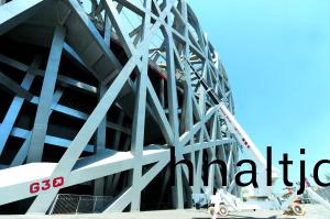 昨日,工作人員利用“蜘蛛車”清理北(bei)京“鳥巢”外圍鋼結構。噹日,從意大利引進(jin)的一檯(tai)高空清洗機械“蜘蛛車”開始對“鳥(niao)巢”外圍(wei)鋼結構進行清洗作業測試。該車酷佀蜘蛛,價(jia)值400萬,可自行“行走”,高度zui大可(ke)達48米。新華社髮