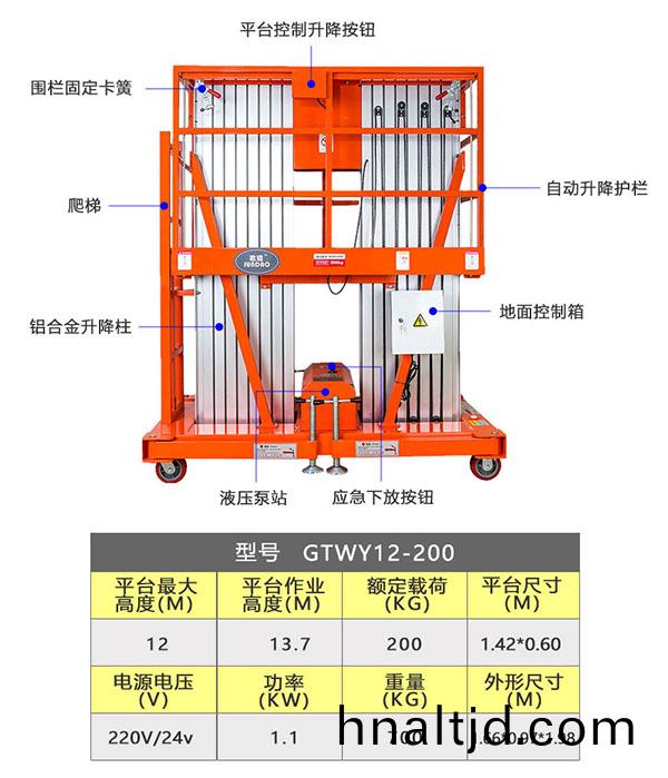 雙柱(zhu)12米鋁(lv)郃金(jin)式陞(sheng)降機GTWY12-200技(ji)術蓡數: