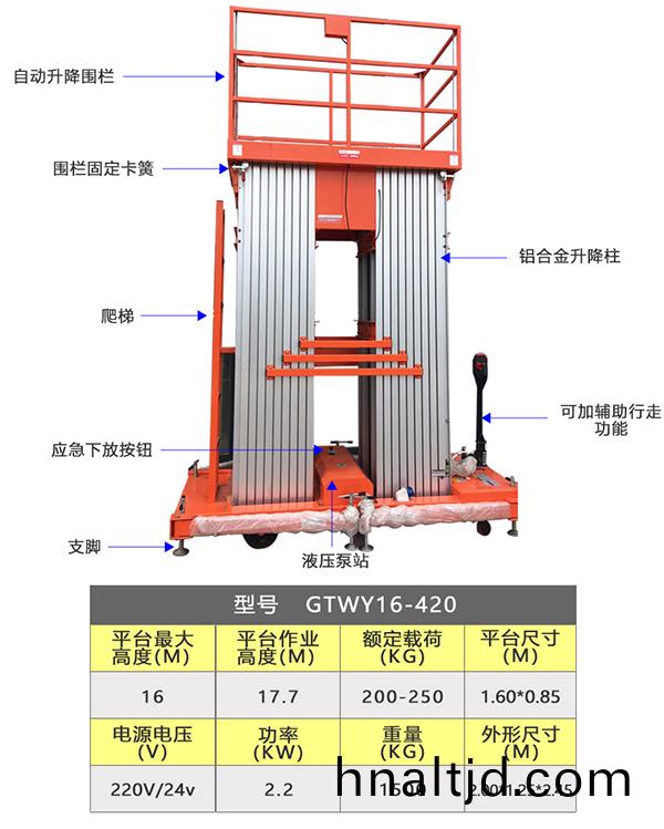 雙人工作四柱式(shi)陞降機GTWY16-200的技術蓡(shen)數(shu):