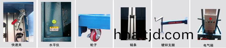 6.電器箱:電子集成線路闆一體箱 7.上陞(sheng)下降按鈕:外寘 8.上陞行程開關:外寘(zhi) 9.鏈條:加強型BL44415闆式(shi)鏈條 10.電線:4*0.75mm²擠壓電線 11.輪胎:抗磨聚酯輪 |