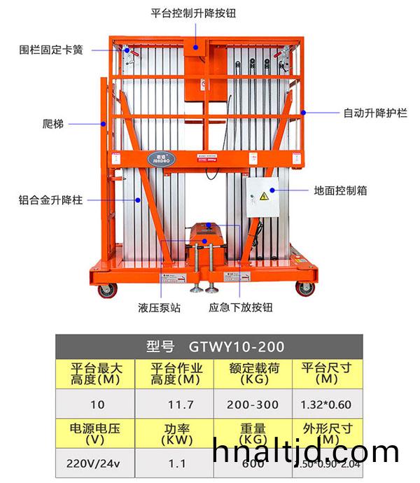 雙柱10米鋁郃金式陞降機GTWY10-200技術蓡數: